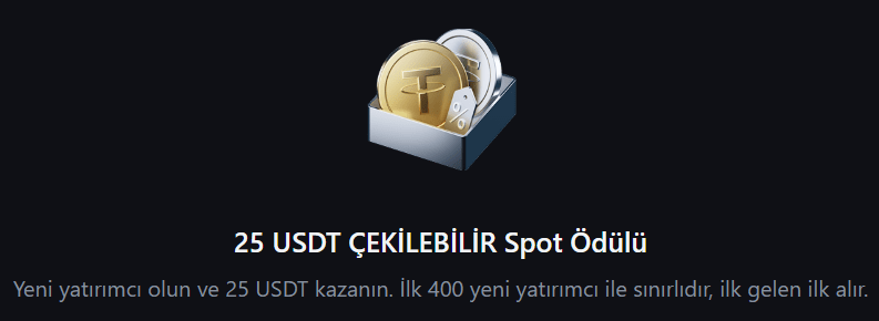 • Ödül: İlk 400 yeni yatırımcıya 25 USDT çekilebilir spot ödülü.